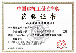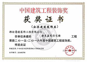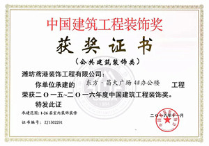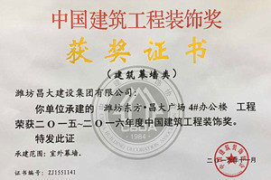 2016年12月23日,2015-2016年度中國建筑工程裝飾獎頒獎大會在北京國際會議中心舉行。集團再獲四個裝飾獎,分別是:裝飾幕墻公司施工的東方?昌大廣場4#辦公樓工程榮獲幕墻類裝飾獎;鳶港裝飾公司施工的東方?昌大廣場4#辦公樓榮獲公共建筑裝飾類裝飾獎;鳶港裝飾公司施工的融發嘉苑住宅樓工程榮獲公共建筑裝飾類裝飾獎;鳶港裝飾公司施工的融發嘉苑住宅樓工程還獲得公共建筑裝飾設計類裝飾獎。 中國建筑工程裝飾獎是全國建筑裝飾行業的最高榮譽,由中國建筑裝飾協會主辦,每年評選,每兩年表彰一次。兩個年度、一個表彰周期實現四個裝飾獎,這是“昌大裝飾”品牌的力量,也是濰坊昌大建設集團逐步實施的“工程全優”、“建筑讓生活更美好”理念的現實寫照。