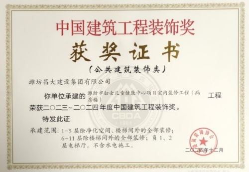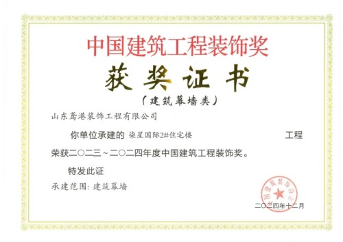 2024年12月10日,中國建筑裝飾協(xié)會在北京召開大會,表彰2023~2024年度“中國建筑工程裝飾獎”工程。集團裝飾幕墻工程公司、山東鳶港裝飾工程有限公司的三項工程榮獲五個獎項:濰坊醫(yī)學院附屬醫(yī)院教學科研病房綜合樓(建筑幕墻類和幕墻設計類)、濰坊市婦女兒童健康中心病房樓(公共建筑裝飾類和公共建筑裝飾設計類),柒星國際2#住宅樓(建筑幕墻類)。